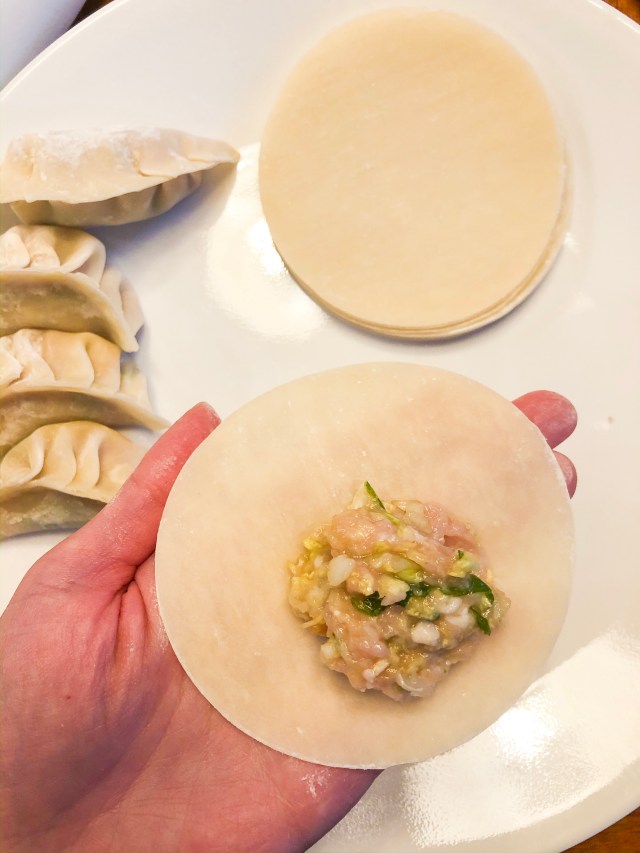 - Get out your dumpling wrappers. Scoop about a tablespoon of filling onto one of the wrappers, placing it off center. With a finger dipped in water, wet the circumference of the dumpling skin, tracing the edges.