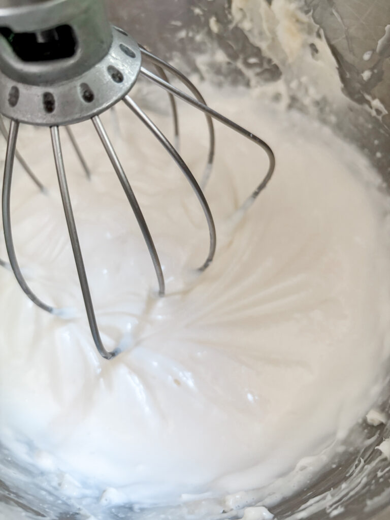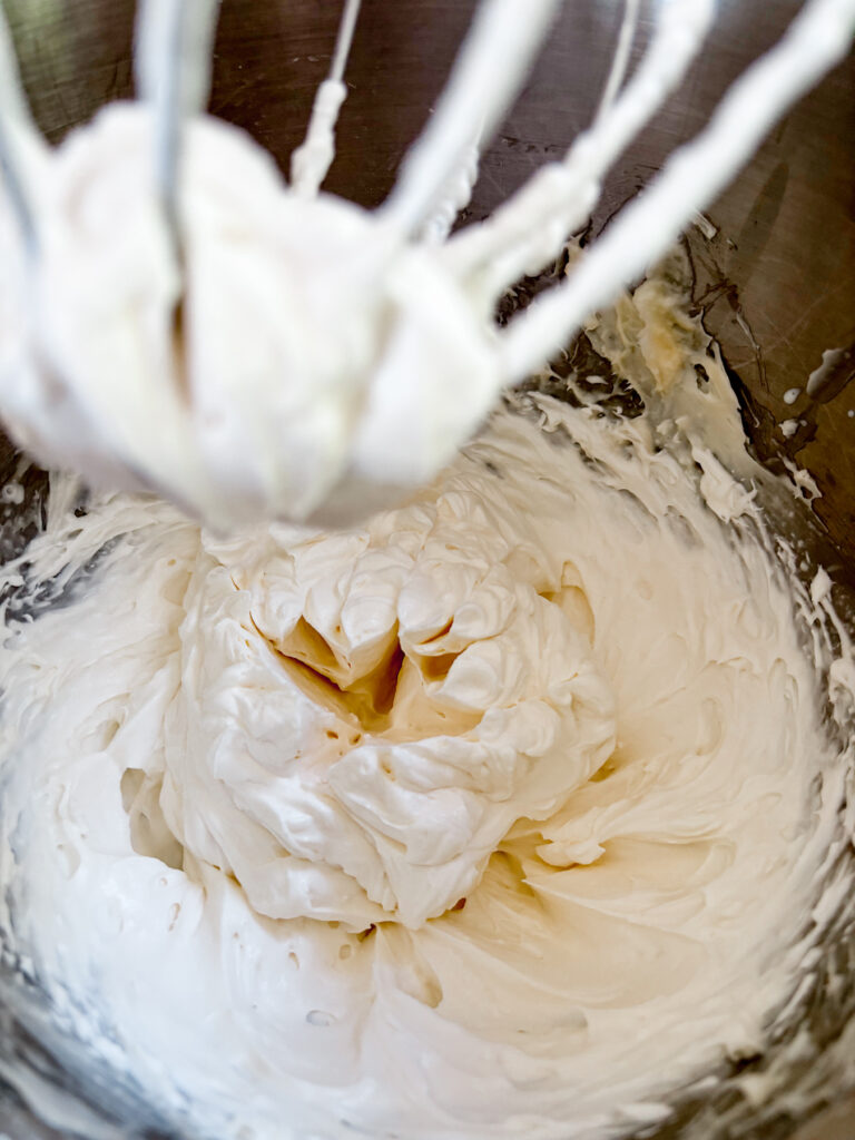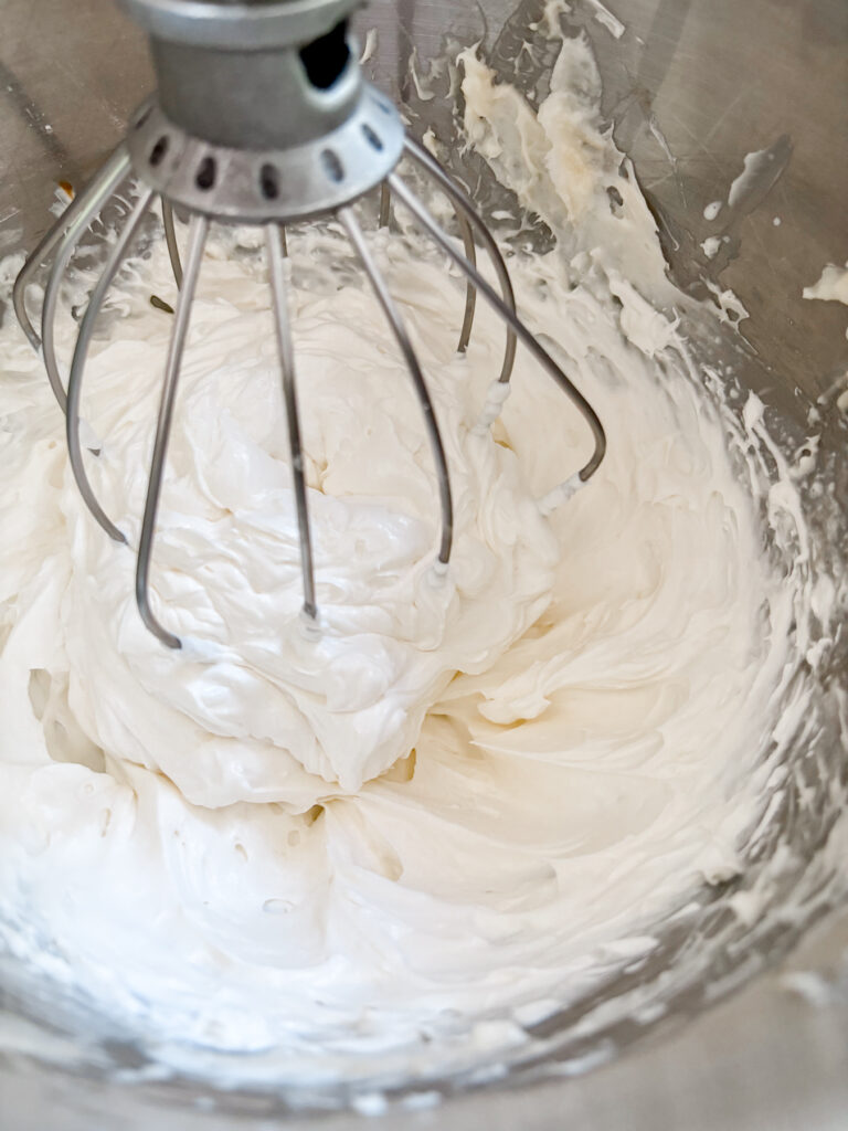 If you’re not familiar with soft peaks vs. stiff peaks, I recommend going on Youtube and just watching a few tutorial videos to get familiar with it. Basically, though, for stiff peaks you want to see the whisk leaving deep tracks in the frosting and when you lift the whisk up, the frosting comes to a point that doesn’t fall or deflate.