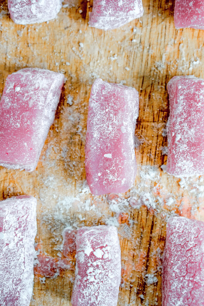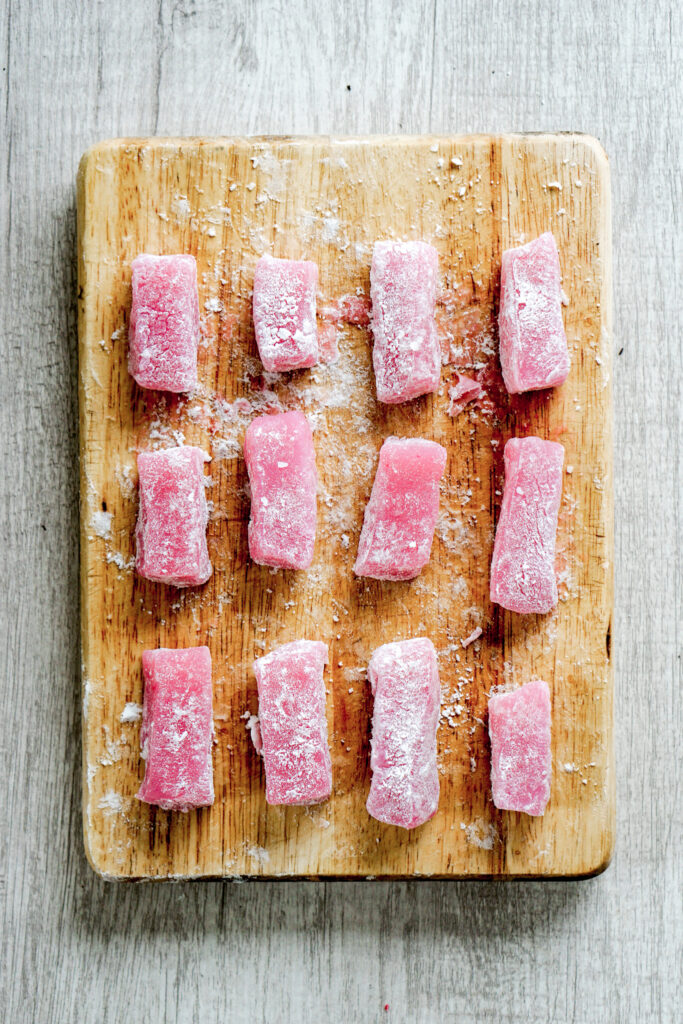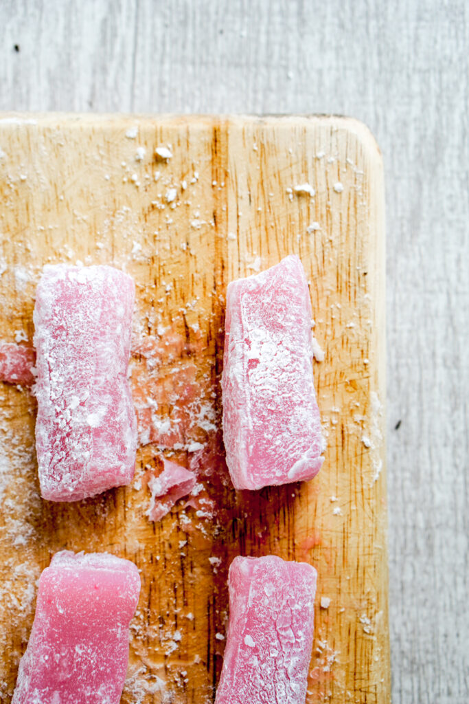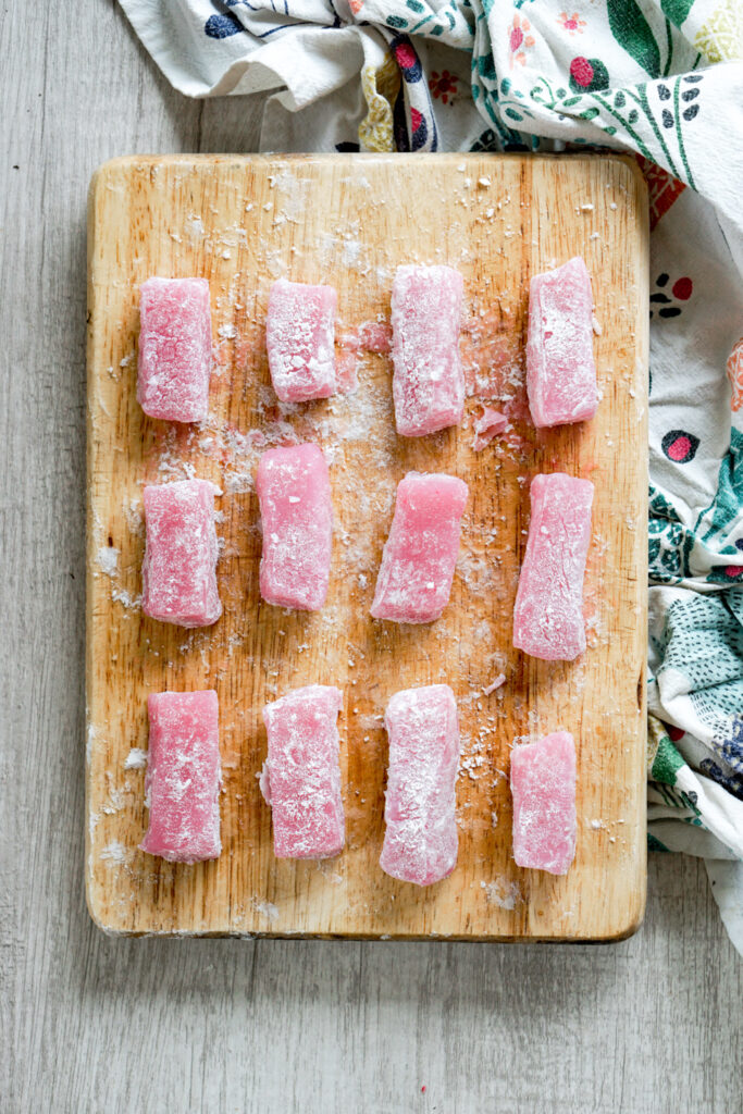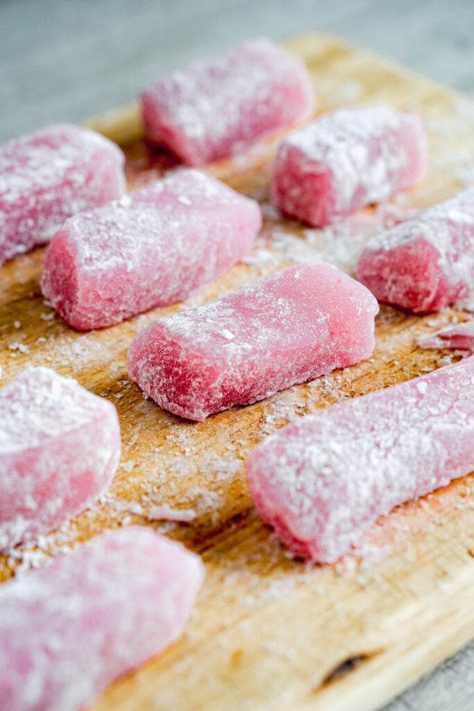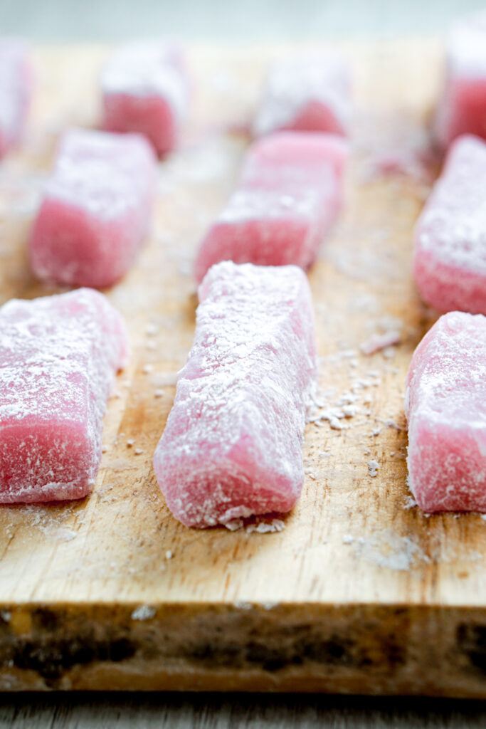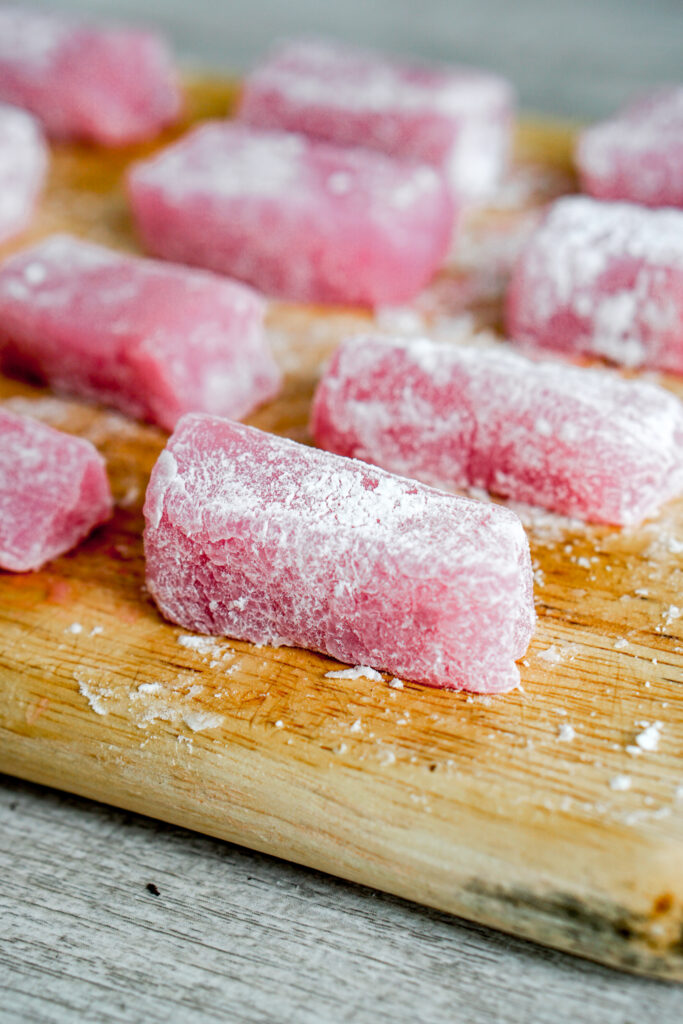 If someone in my family says they want to each mochi, they are usually thinking of chi chi dango. โDangoโ in Japanese means dumpling, or something small and round-ish in shape. As the name implies, chi chi dango is a mochi dessert consisting of chewy, sweet, rice dumpling bites. You often find them shaped as rectangles, like caramels or taffy, and theyโre very popular in Hawaii. If youโve never have chi chi dango before, they are most similar to the little mochi bites you find at froyo shops.