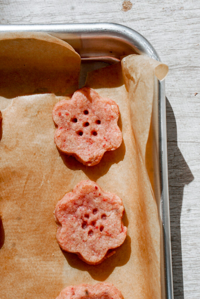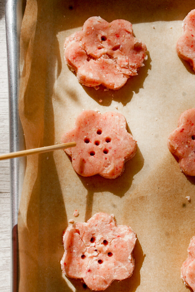 - After 15-20 minutes, remove dough from fridge and transfer to a silicone mat or other clean work surface lightly dusted with flour. Use a 1 inch cookie cutter (or other shaped cutter, stamp, or press) to cut out your cookies. If doing a cherry blossom shape, use the blunt end of a toothpick to poke holes in the center for the stamen design. With a 1 inch cookie cutter, you can get about 24-30 cookies.