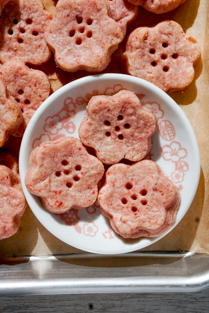 Of course, outside of cherry blossom season, these cookie would look super cute with a strawberry shaped cookie cutter, right? Heart shapes work well for Valentine’s Day too! See how versatile this recipe is?
