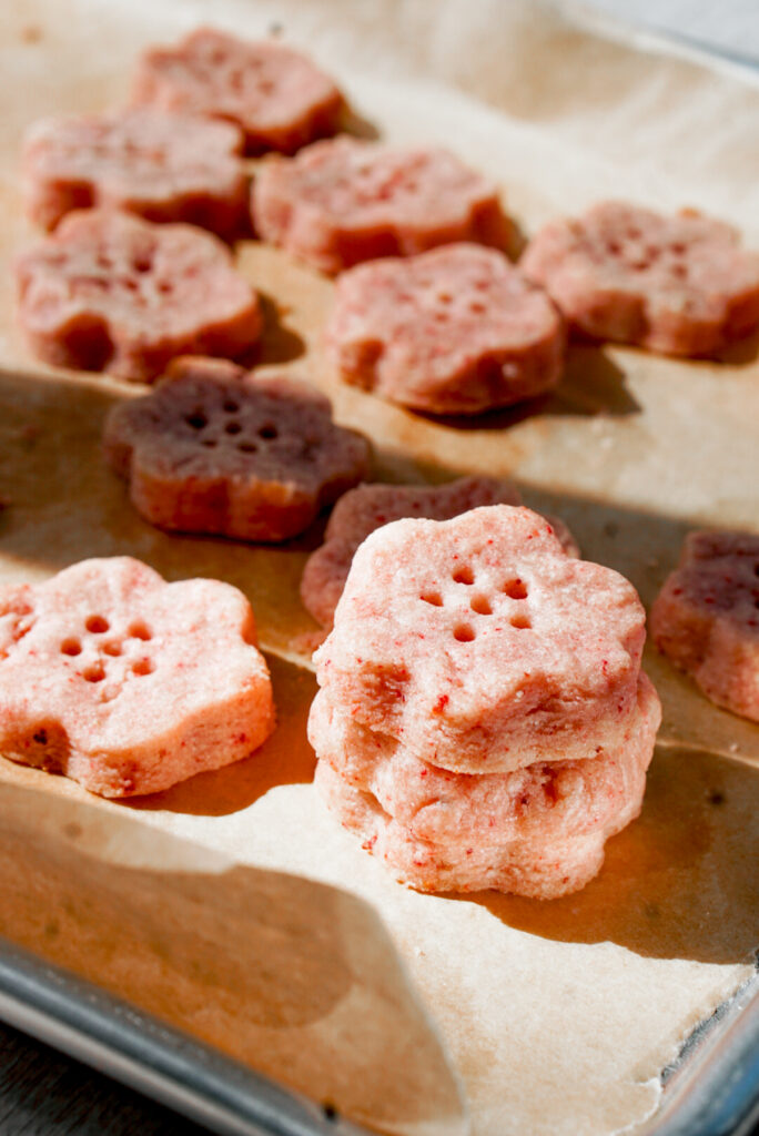 You can, however, substitute other freeze-dried fruit to make other fruity shortbread! I’ve used freeze dried raspberries to make a raspberry shortbread, which was delicious and very tart! I expect blueberries would also work well. I recommend substituting by weight and not by volume, as the shape of the fruit differ wildly.