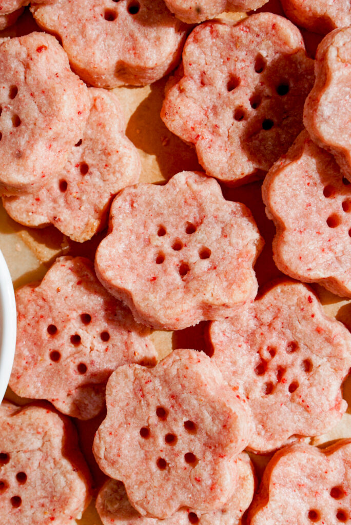 Make the cutest pink cut out cookies with this easy strawberry shortbread cookie recipe. This recipe is not too sweet and has a slight tartness from freeze dried strawberries. Disclaimer: This post may contain affiliate links.