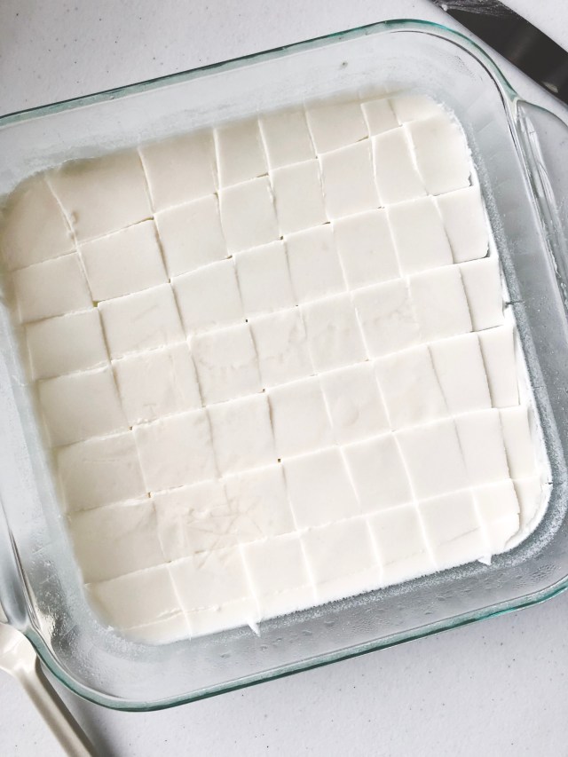 - Pour mixture into 8ร8 dish and leave to cool in the fridge at least two hours or overnight.