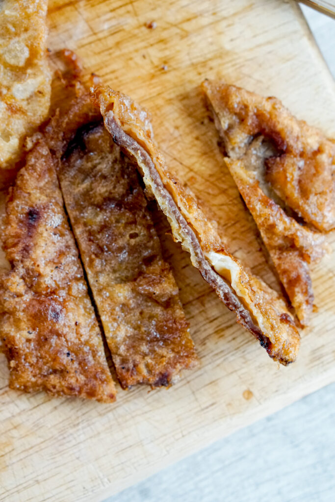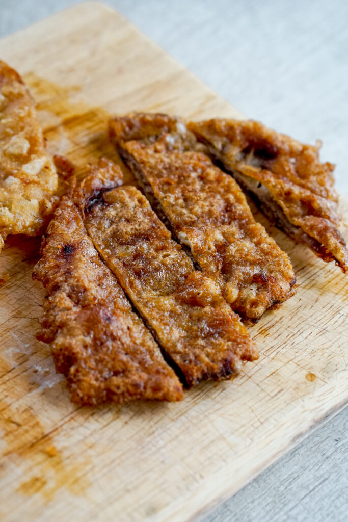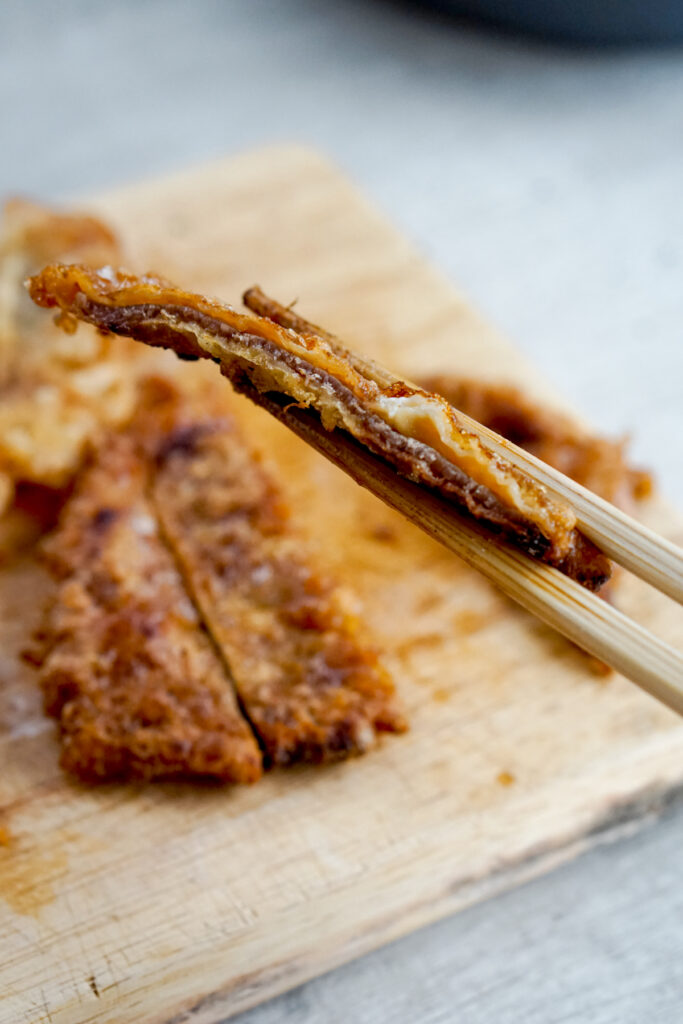 Meat jun is a Korean influenced dish from Hawaii. It consists of a super thin steak that has been marinated in a sweet soy sauce mixture and then is battered and fried. Just that description alone should make you start salivating. It’s shallow fried, not deep fried, although you could if you’re feeling extra ambitious. And there’s no breading; just an egg batter. The end result is a sweet and salty thin steak with a tempura-like crust. You typically would cut it into strips like a katsu and serve it with rice.