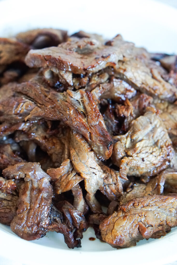 So I’ve seen a lot of recipes out there for making a “tender beef teriyaki stir fry” where they velvet the beef in cornstarch and stir fry with veggies and/or noodles. If that’s what you’re looking for, I’m sorry, you won’t find that here. Those kinds of teriyaki stir fries with vegetables like carrots, snow peas, bok choy, noodles like lo mein, and lots of aromatics like garlic and ginger are not really Japanese dishes. No judgment; I’m sure they taste delicious, but that’s not something my family makes or eats. You can even kind of tell from the ingredients that the dish leans more towards Chinese cuisine, although teriyaki is not popular in Chinese cooking. Those stir fries like you’ll find at Panda Express are definitely American. Again, no hate, we love Panda Express. It’s just not the kind of food we make at home.