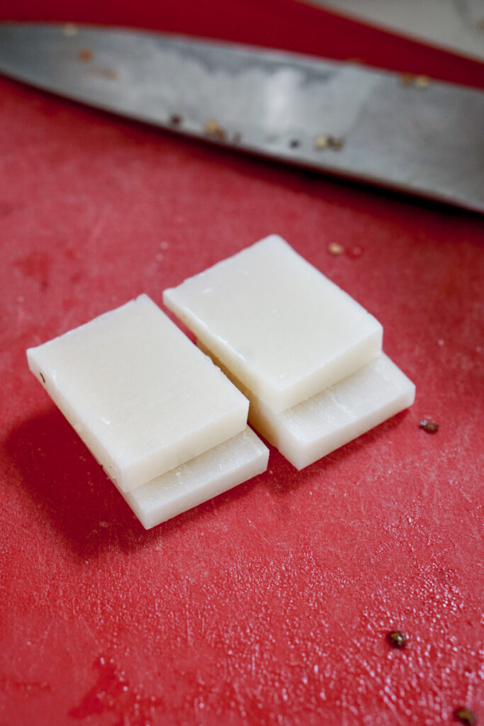 - Slice kiri mochi in half crosswise. Then turn each slice on its side and slice again to split its thickness in half (see video because I have a really hard time explaining this).