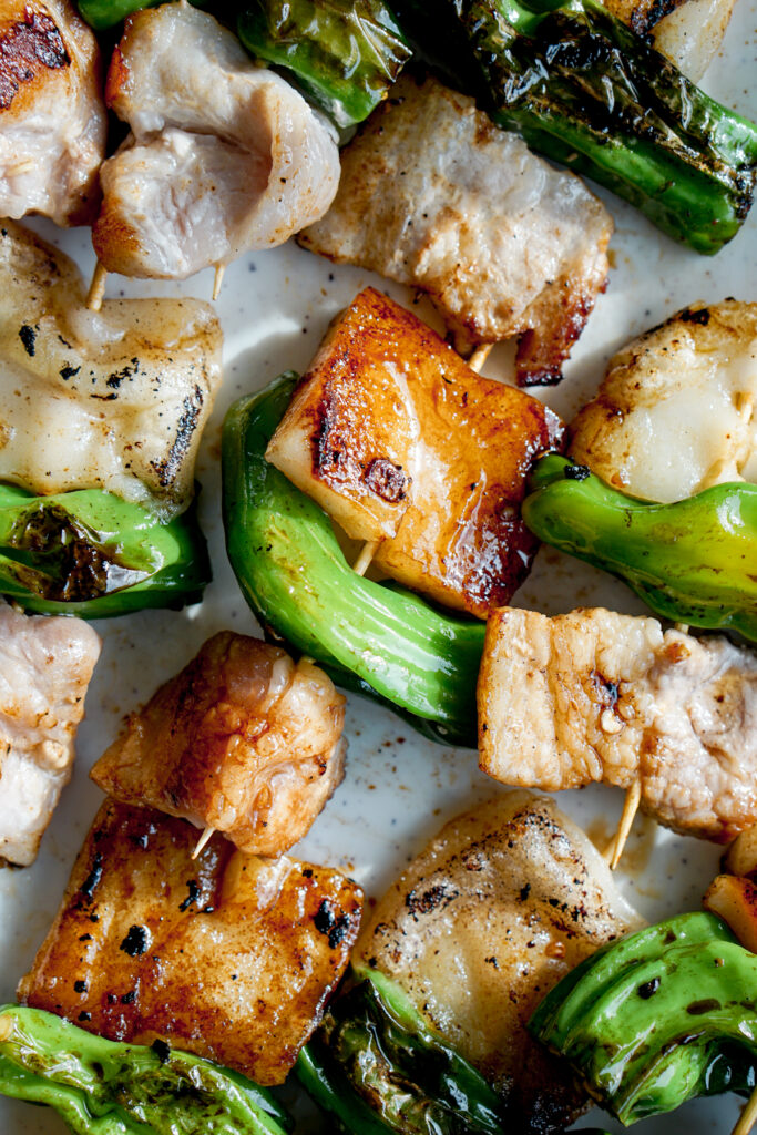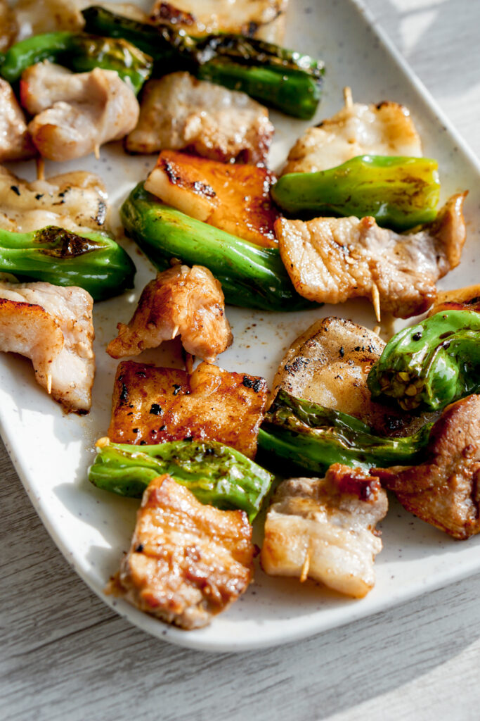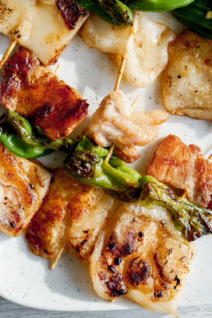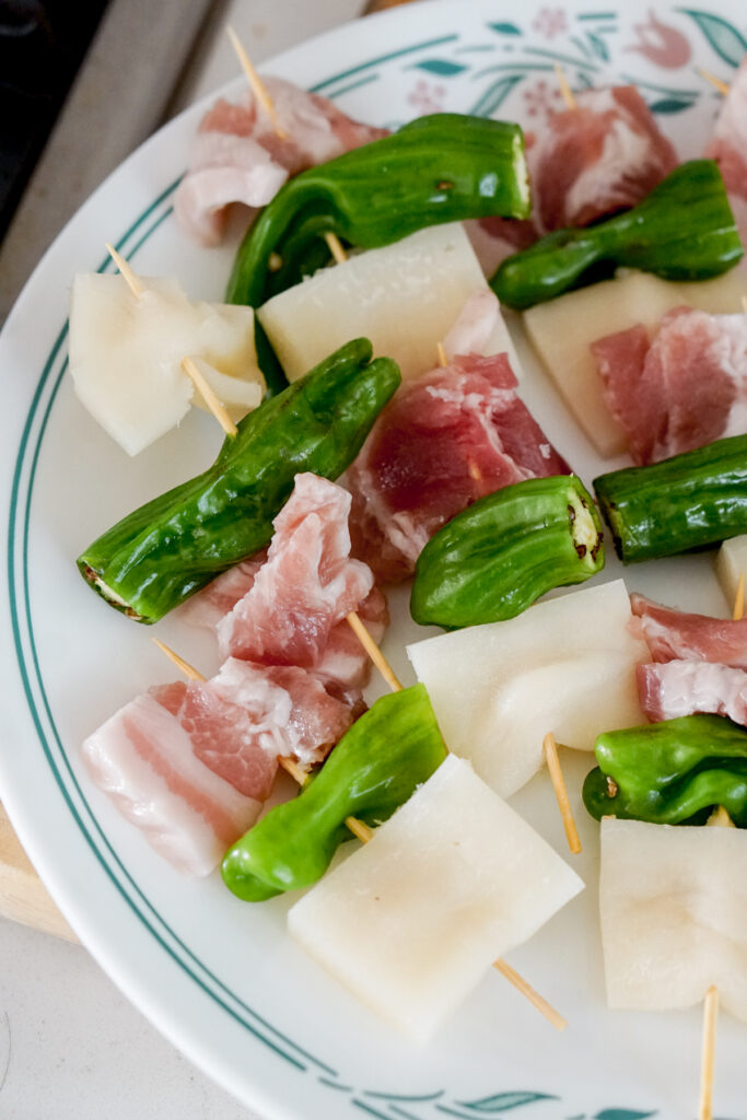- Thread the mochi, then shishito pepper, and then a piece of pork belly onto a skewer. Repeat until you've used up all your ingredients; you should have enough to make 20-25 skewers.