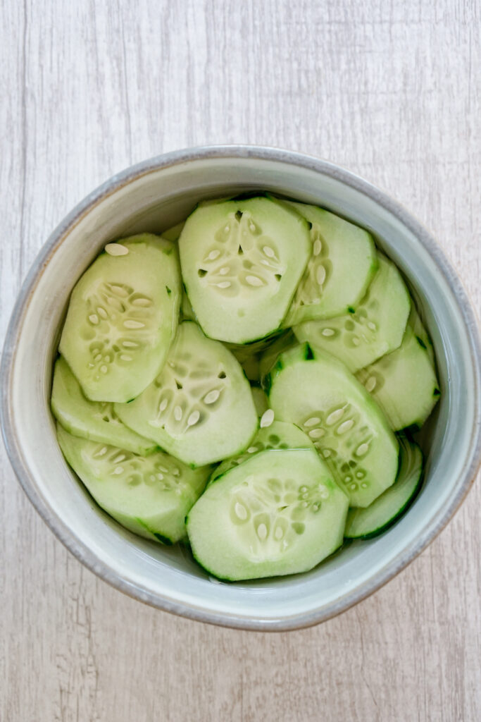 Most traditional sunomono recipes Iโve seen donโt use water, but mine does. Why? Well, mainly because I just like it better. I find that without the water, the pickles get a little too acidic for my tastes. It also helps with making big batches. I donโt have to dump huge amounts of sugar and vinegar to scale up my recipe because the water makes it easy to submerge everything in the liquid.