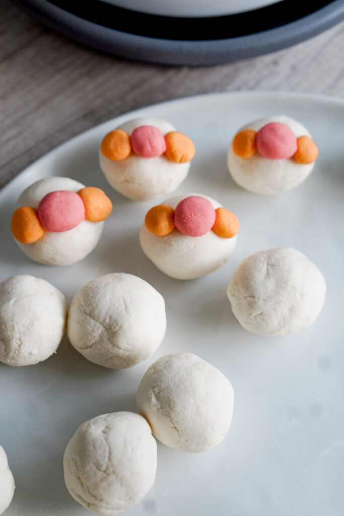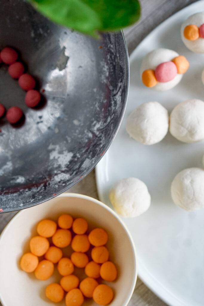 For Anpanman, break off two 20g portions of dough. Dye one red and one orange. Divide the remaining white dough into balls for Anpanmanโs head. Then roll two small orange balls for the cheeks and one slightly larger red ball for the nose. I used a food safe paintbrush dipped in black sesame paste to paint the eyes and mouth on after cooking.