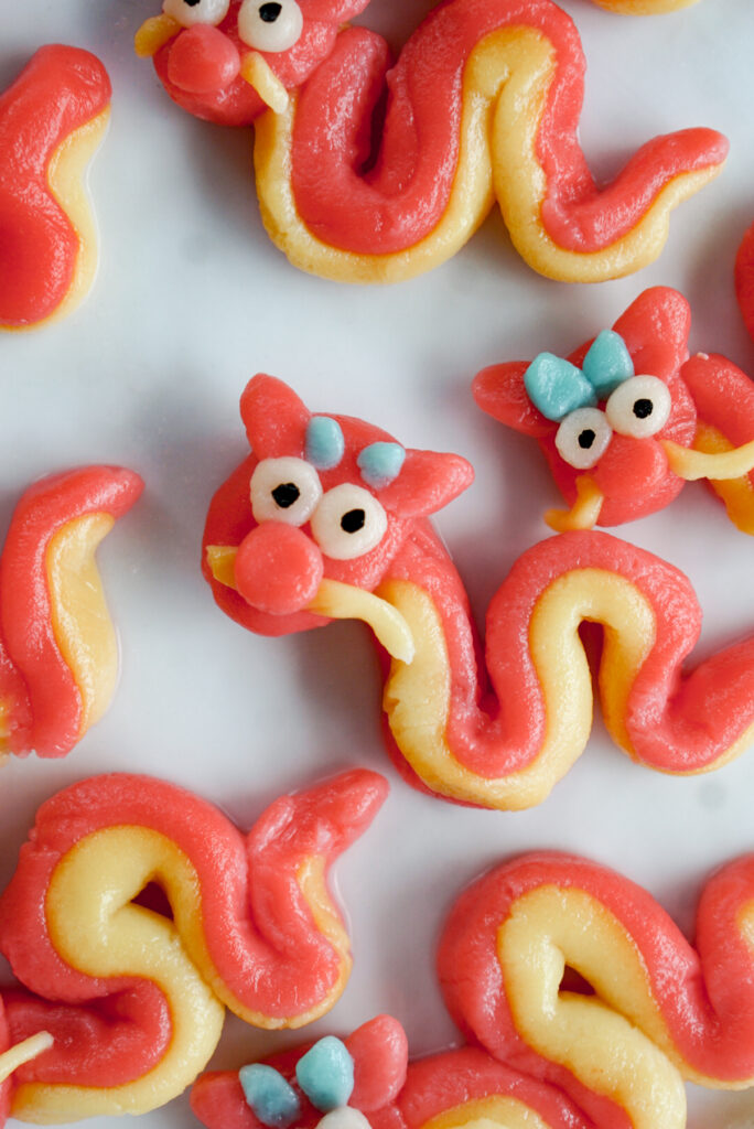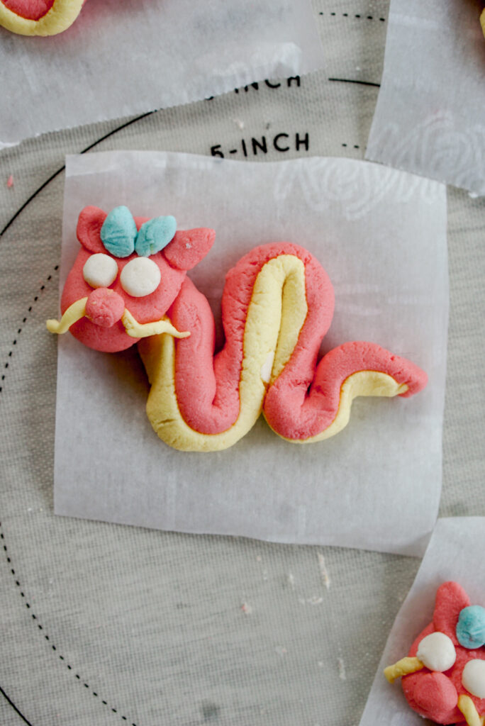 This one was way more intense, so only attempt if you really enjoy the crafting process! Roll a 3 inch long red rope for the body and a much thinner yellow rope for the belly. Place the yellow on top of the red and roll to adhere. Assemble your red and yellow body into a โWโ shape and place on parchment paper. Shape a rectangle out of red dough for the head and attach to one end of your โW.โ Roll two small triangles of red dough for the ears. Make very thin yellow ropes for the whiskers and top with another small ball of red for the nose. Make two small blue triangles for horns. Finally, add two small white pieces of dough for eyeballs. Paint in the irises after boiling! See my video here: