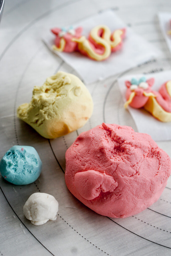 To make fun character dango, the basic recipe remains the same! Instead of rolling the dough into balls, youโll separate it according to the number of different colors you want. Dye each section using gel food coloring. I use this set from Americolor. To assemble, you just create your characters the same way you would play with clay or Play Doh. It takes some creativity and time, but itโs so much fun. Iโve found that if I keep my dough slightly on the wetter side, all the pieces adhere with just a little pressure. If your dough is a little dry and the pieces seem to fall off, you can adhere them simply by dabbing some water. When Iโm ready to cook my dango, I always like to do a test run of 1-2 dango first, to make sure that the pieces stay together when boiling.