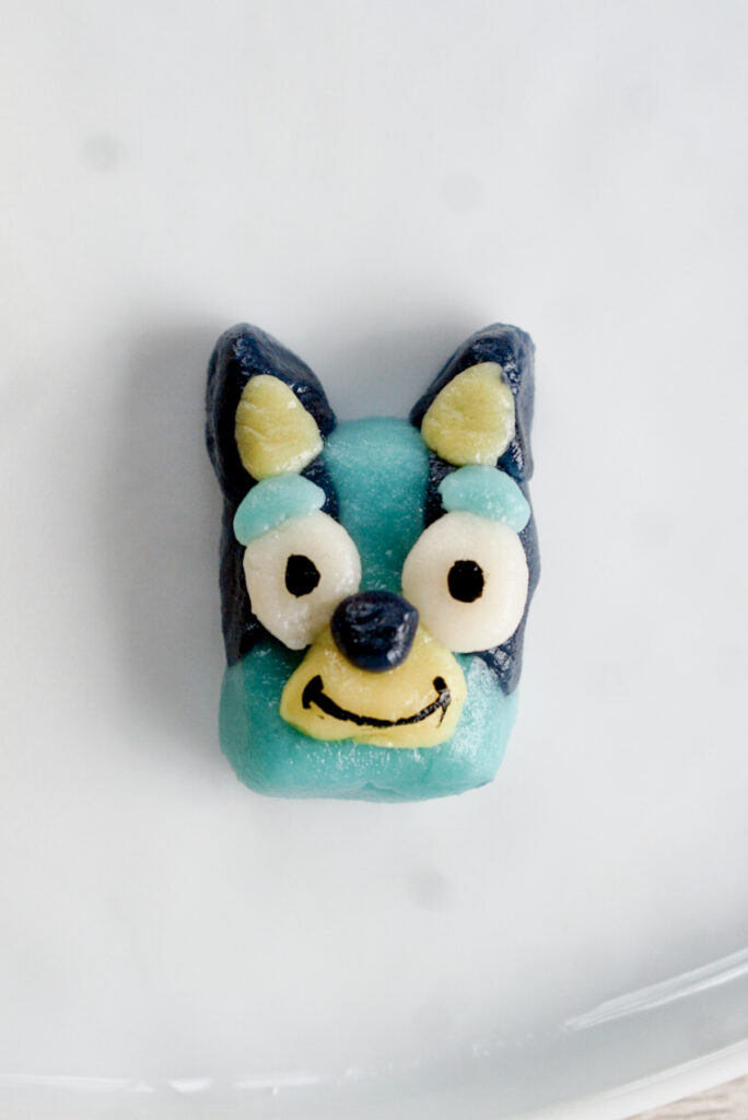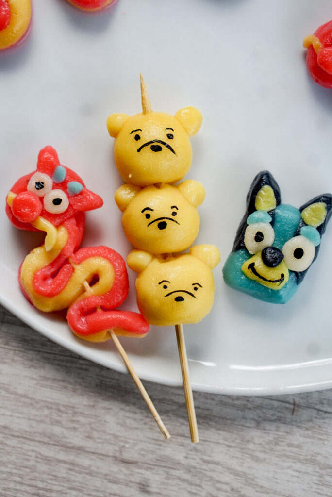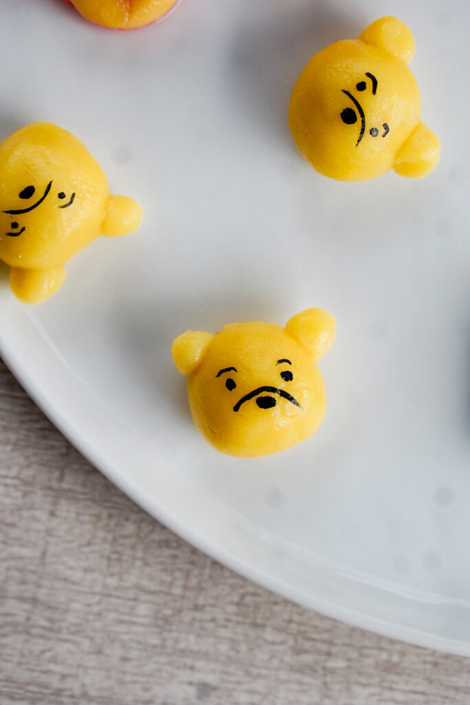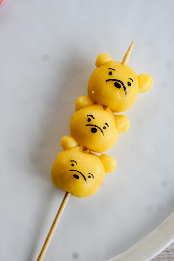 Winnie the Pooh dango is really easy because itโs all one color! Dye all your dough yellow. Roll two small balls for the ears and one medium one for the head. I painted the faces with black gel food coloring on this one.