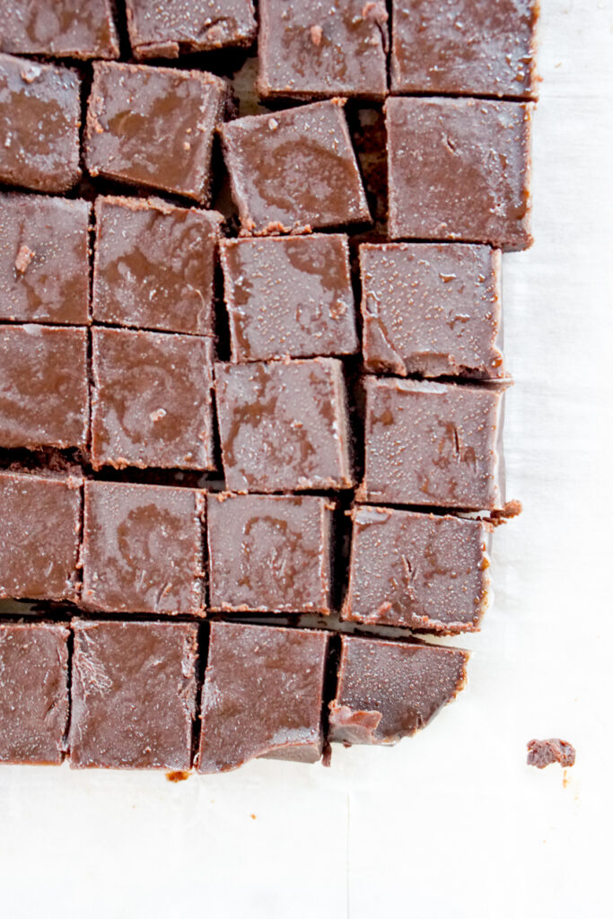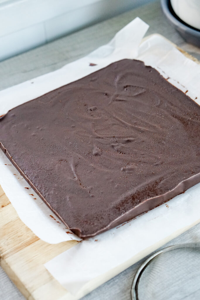 - Continue mixing the chocolate until well combined and pour into your lined 8ร8" pan. Chill uncovered in the fridge for at least 3-4 hours and up to overnight.