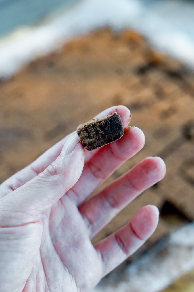- Slice chocolate into small squares (about 1 inch by 1 inch). If chocolate is sticking to the knife, you can rinse with hot water in between slices.