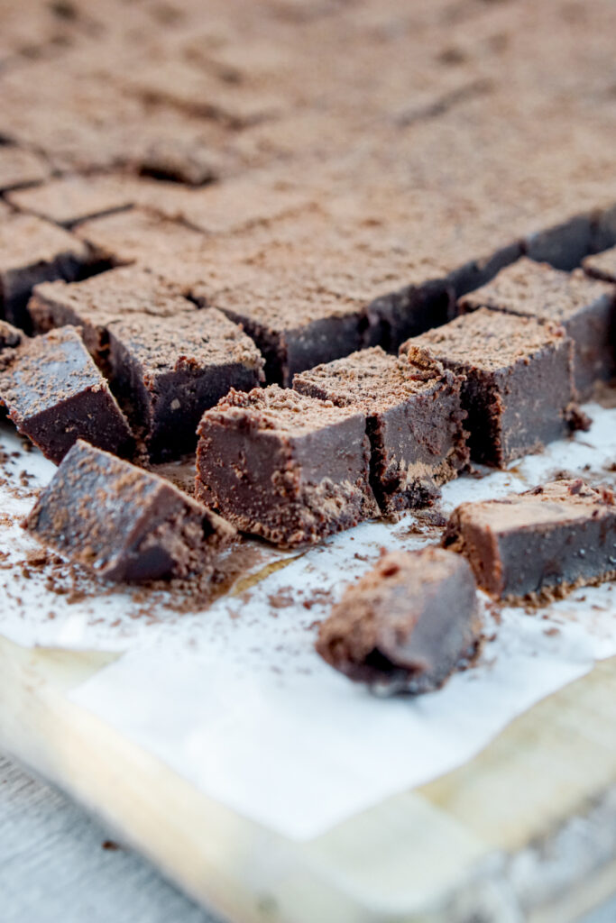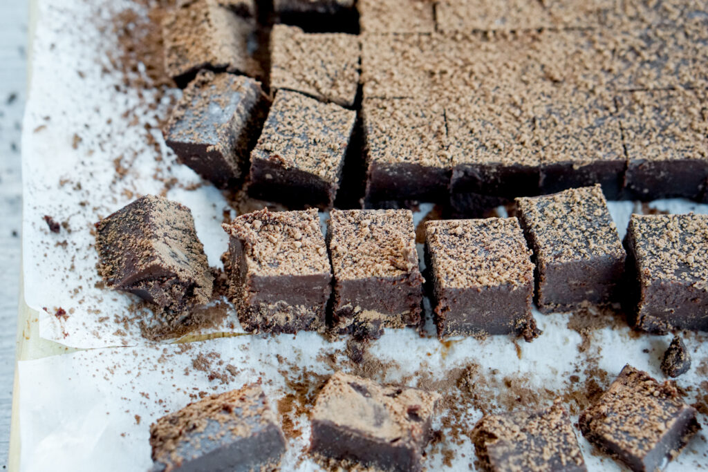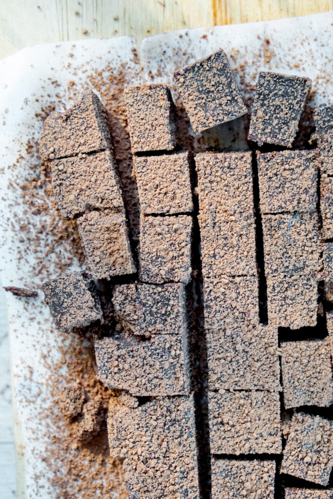 As nama chocolate is made with heavy cream, it is basically just a cubed version of a chocolate truffle. Chocolate truffles are made from a mixture of heavy cream, chocolate, butter, and liquor that you roll into balls and then dust with cocoa powder or other toppings. Rolling the truffles into balls actually gets quite messy, so Iโm a big fan of nama chocolate instead, which requires only slicing into squares.