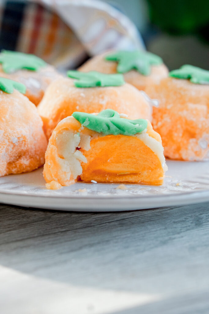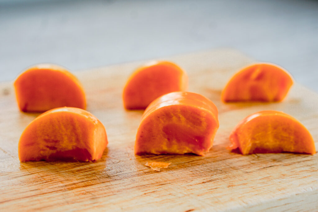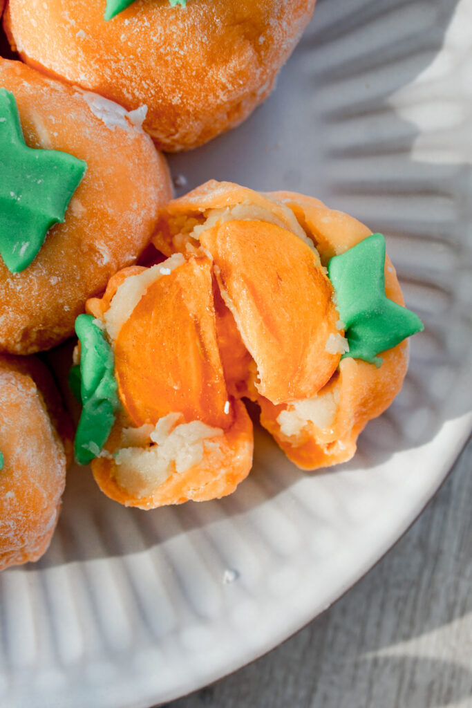 Time for another fun mochi twist: persimmon daifuku! While daifuku is traditionally stuffed with bean paste and sometimes a strawberry, switching up the fruit means you have mochi for every season. Persimmon, known as kaki in Japan, is a great flavor for fall!