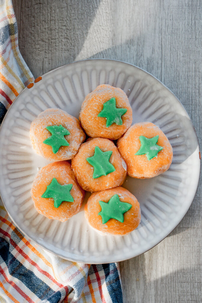 Youโll notice that my photos of this daifuku are a little different from previous ones in that they have a little decoration on top. This leaf decoration is entirely optional, but I thought it would be cute to decorate the persimmon daifuku like an actual persimmon. The decoration itself is made out of nerikiri, which is another type of Japanese dessert. Nerikiri is a wagashi (aka Japanese sweet) made from mixing white bean paste and a mochi-like dough into something like play-dough. Similar to marzipan, you can then sculpt nerikiri into a variety of shapes and dye it a variety of colors. There are some really gorgeous nerikiri artists out there, and I am not on that level, so I just cut out some very crude shaped leaves out of mine.