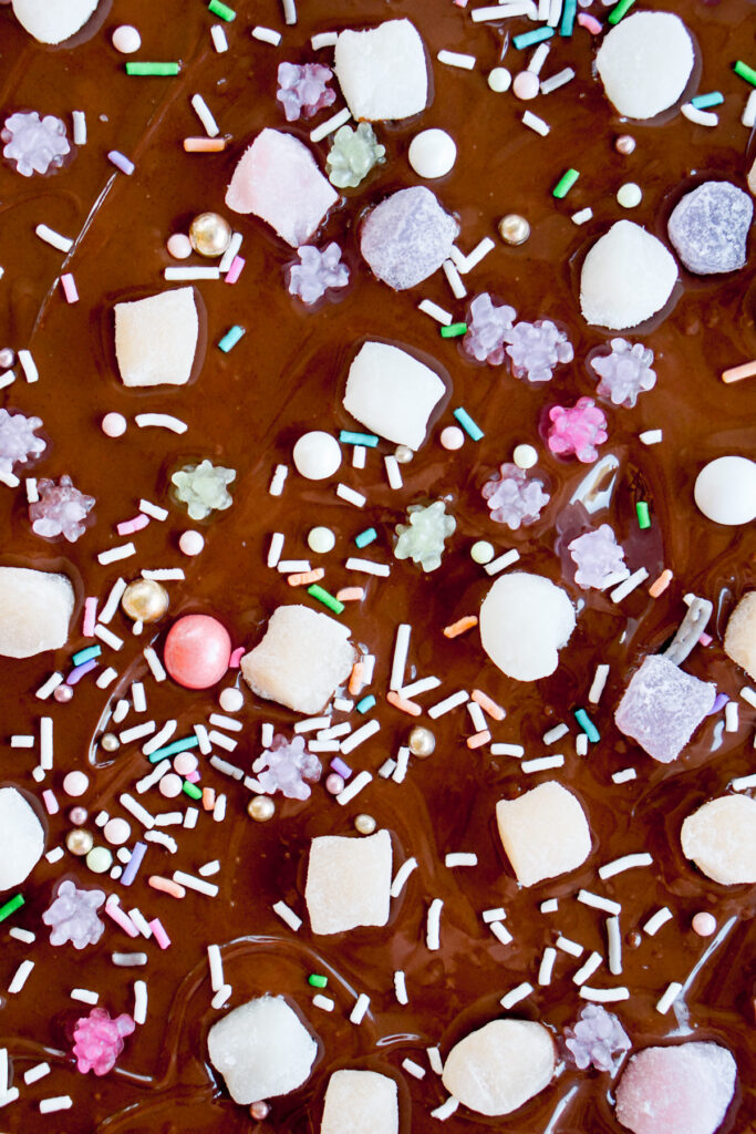 This mochi konpeito chocolate bark is an easy, shareable dessert that incorporates the flavors of popular Japanese sweets. Simply line a tray with graham crackers, top with melted chocolate, and sprinkle with mini mochi, konpeito, sprinkles, and whatever other fun toppings youโd like! This dessert is great to make with kids and bring to a party.