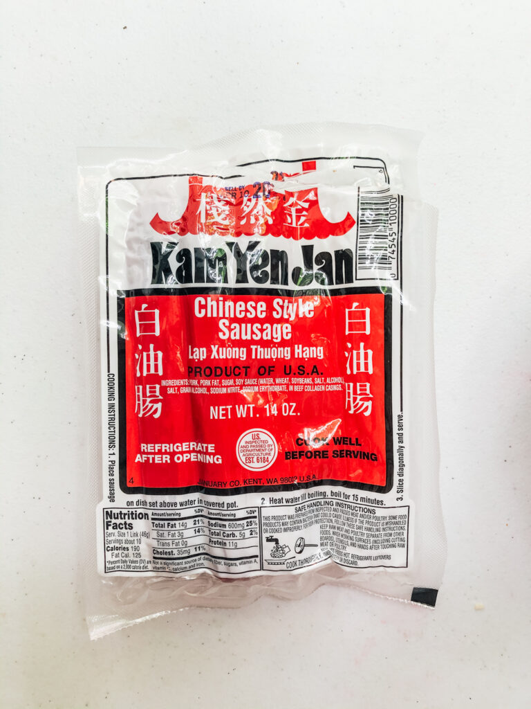 Lap cheong is the generic Cantonese name for Chinese sausage. The main difference between Chinese sausage and typical American sausage is that Chinese sausage is much, much sweeter. To me, this balance between sweet and salty is perfect for a complete meal, instead of leaving me craving pancakes. You can find dried lap cheong in packages at any Asian grocery store, or even some Costcos! Itโs kept at room temperature until you open it, which makes it great for stashing in your pantry as emergency food. You can find fresh lap cheong too at some markets, but even my grandparents buy the dried stuff, so why shouldnโt you?