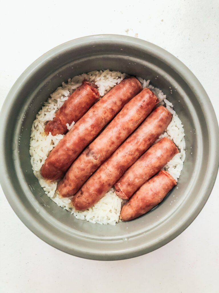 Put the sausage on top of your rice + water. Push the button. Wait. Eat.
