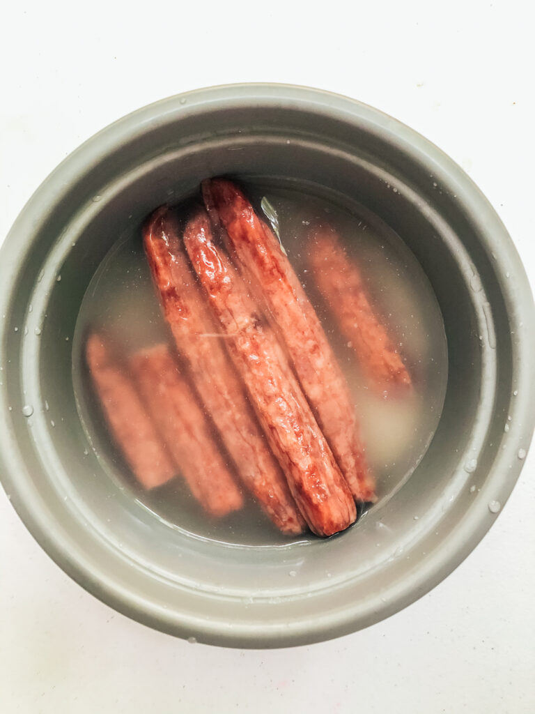 Cook in rice cooker as you normally would cook rice. (Optional: cook some vegetables while waiting.) When rice is done, so is your sausage!
