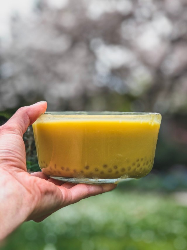 While I’ve seen other mango sago recipes that call for blending mango into a puree before mixing it into the coconut milk, I opt for convenience. And as an added bonus, you have less dishes to wash. You can soak the sago prior to boiling or not, it doesn’t make a huge difference in texture in my opinion. Then, just mix all the ingredients together and boil on the stovetop. That’s it! If you leave the sago to chill in the fridge overnight, you’ll end up with a thick, pudding consistency the next day. You can eat is as a pudding or thin it out with more juice to bring it back to a soup. Really, you can just eat this however you want. Give it a try!