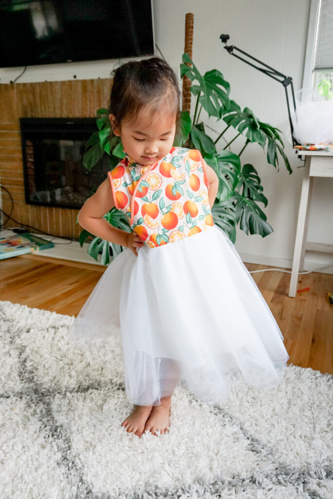 Before inserting the zipper down the back, I made and attached the tulle skirt. I cut 5 layers of a half circle skirt out of white tulle. In order to get the gathers, I used 1.5x the measurement of my daughter’s waist. The lining was made using leftover fabric. I didn’t have enough for a half circle, so I just used a quarter circle skirt with no gathers.