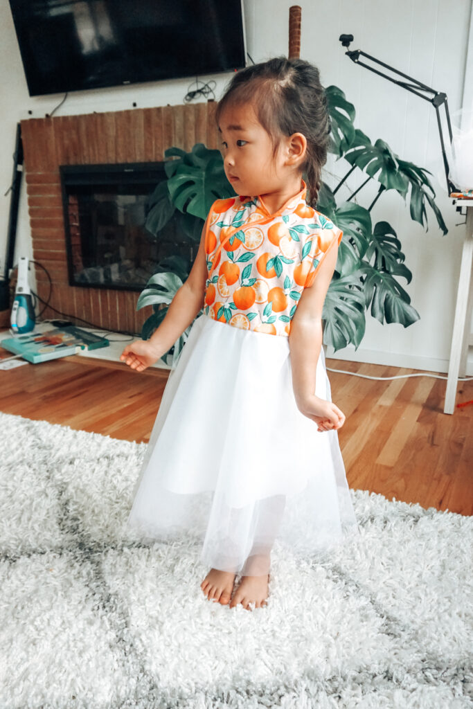 But anyhow, my 3 year old is obsessed with “princess dresses,” which to her means anything with a fluffy tulle skirt. So of course, I decided to add a tulle skirt to her cheongsam. I measured the length of her torso from her shoulder to waistline/where I wanted the skirt to start. Using the free pattern I downloaded, I simply traced and cut my fabric only to that length.