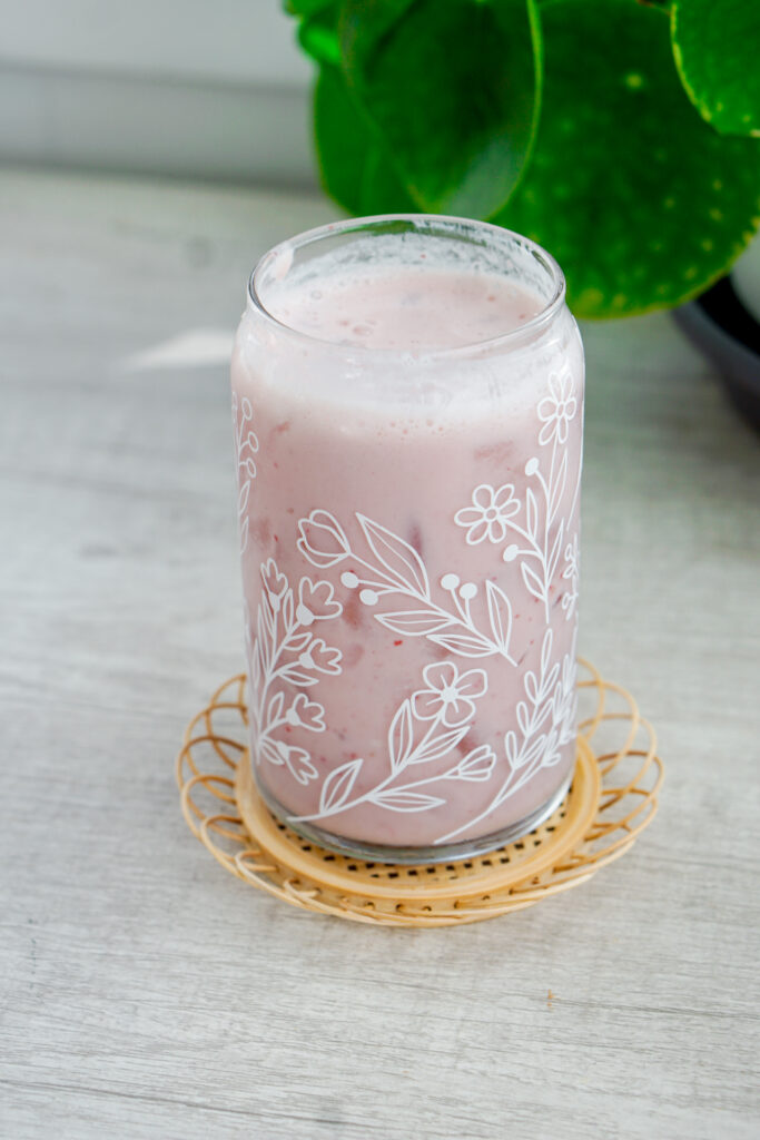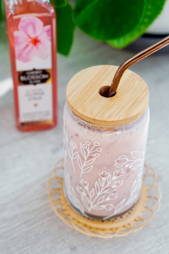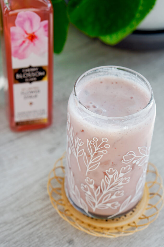 Aside from the cherry blossom syrup, the rest of this sakura strawberry latte recipe does not require any hard to find ingredients. This drink is essentially a strawberry milk with cherry blossom syrup mixed in.