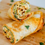 Take the tortilla jian bing off the heat, roll into a burrito shape, and slice in half. Eat while fresh off the griddle!