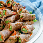 Take a thin slice of beef and place two green beans and a few matchstick carrots at one end. Roll the vegetables in the beef, covering the length of the vegetables.