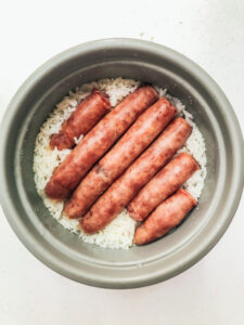 Cook in rice cooker as you normally would cook rice. (Optional: cook some vegetables while waiting.) When rice is done, so is your sausage!