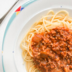 The absolute EASIEST and TASTIEST semi-homemade meat sauce. Only 5 ingredients and ready in less than half an hour, it's perfect for weeknight spaghetti. Recipe adapted from our family friend, Mary Asami.