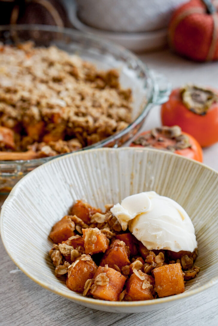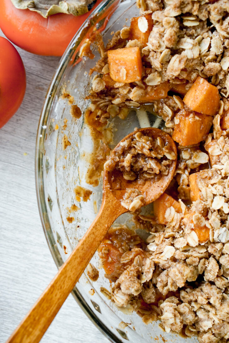 I happen to really like oats, and I think their crunchiness pairs well with the little bit of crunch you can get in a fuyu persimmon, which is why I went for a crisp in this recipe.