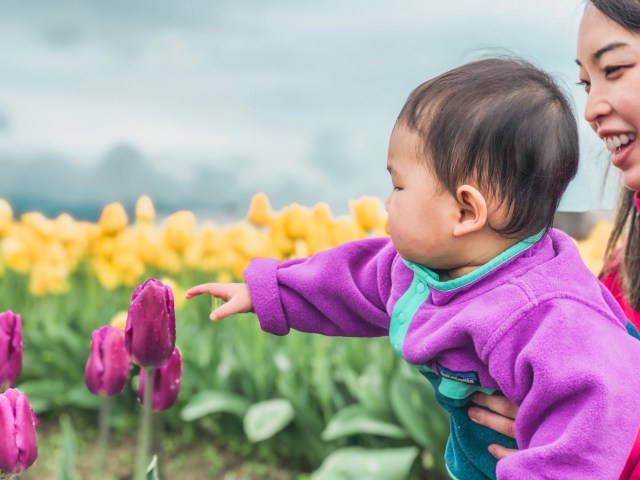Iโd never been to see the Skagit Valley tulips before, and we thought this would be a good year to go so we could take more baby photos. For those of you who donโt live in the Seattle area, there are tulip fields about 1.5 hours from Seattle that bloom every spring. Tons of people go just to take photos in the fields. Itโs similar to the Carlsbad flower fields near San Diego. Theyโre nice to look at, but it sure does get crowded.