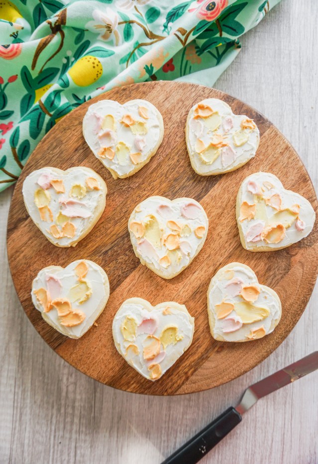 For the watercolor effect, just take your spatula and swipe over the tops of the cookies, smoothing out the surface. Thatโs it! If you have too much frosting, just scrape your spatula on the edge of a bowl or on a towel. (Note: You donโt need to put your cookies in the fridge before smoothing out the tops; you want the buttercream to still be wet so the colors run into each other.)