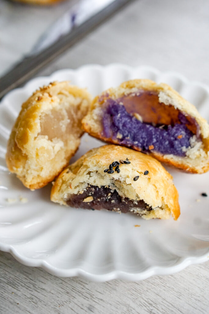 - The purple sweet potato filling you see in the photos is my homemade Okinawan sweet potato jam! It’s so good! It tastes like an Okinawan sweet potato haupia pie in a manju. However, if you really don’t want to make the jam, you could fill it just with mashed, cooked Okinawan sweet potato and a little sugar.