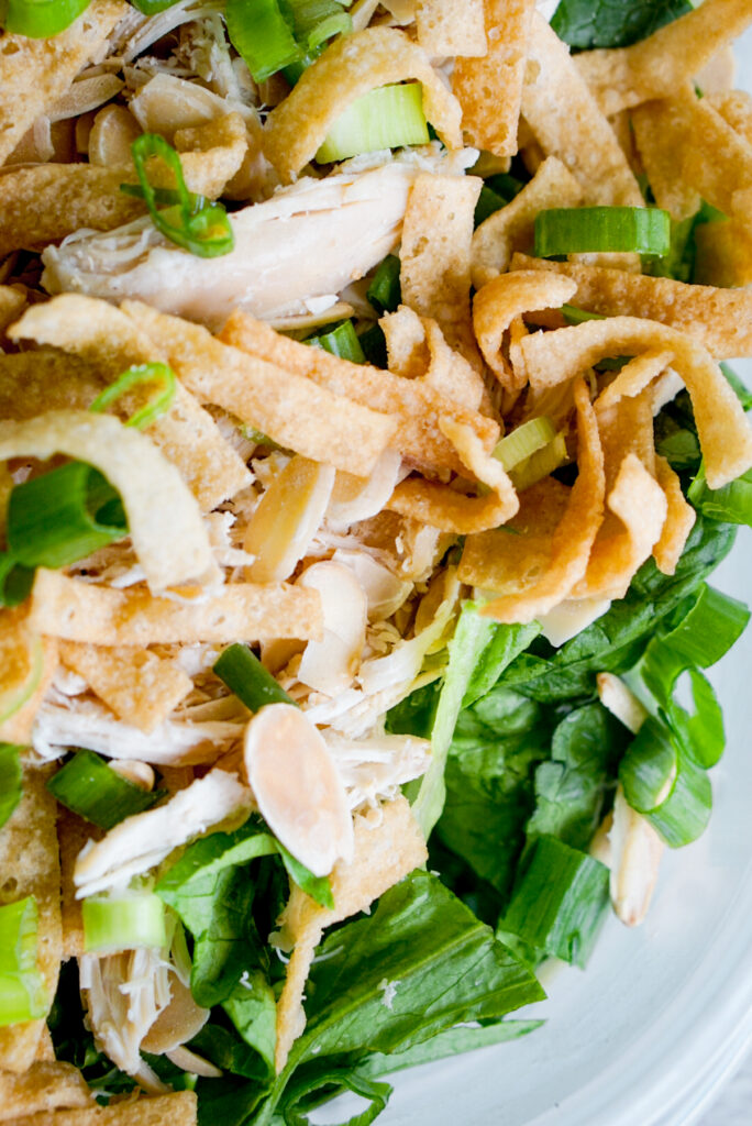 The MOST IMPORTANT INGREDIENT that all recipes have in common and absolutely cannot be omitted is the fried wonton strips! Okay, obviously the shredded chicken and the lettuce also cannot be omitted or it’s not a chicken salad, but the most BELOVED ingredient is the wonton strips. Unfortunately, this does mean that this is not gluten-free, as I haven’t been able to find any gluten-free wonton strips. But on the plus side, you can find these at most grocery stores so you don’t have to deep fry them yourself.