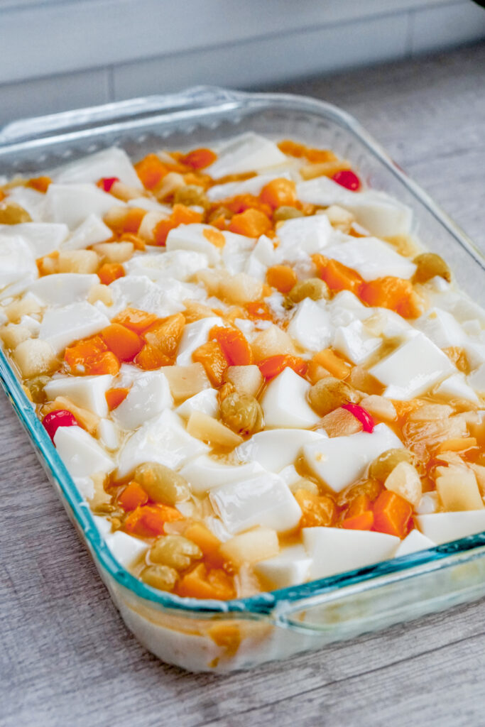 - When ready to serve, use a knife to slice your jello into cubes directly in the dish. Pour two cans of fruit cocktail directly over your jello cubes and stir to mix. Leftovers can be kept in an airtight container in the fridge.