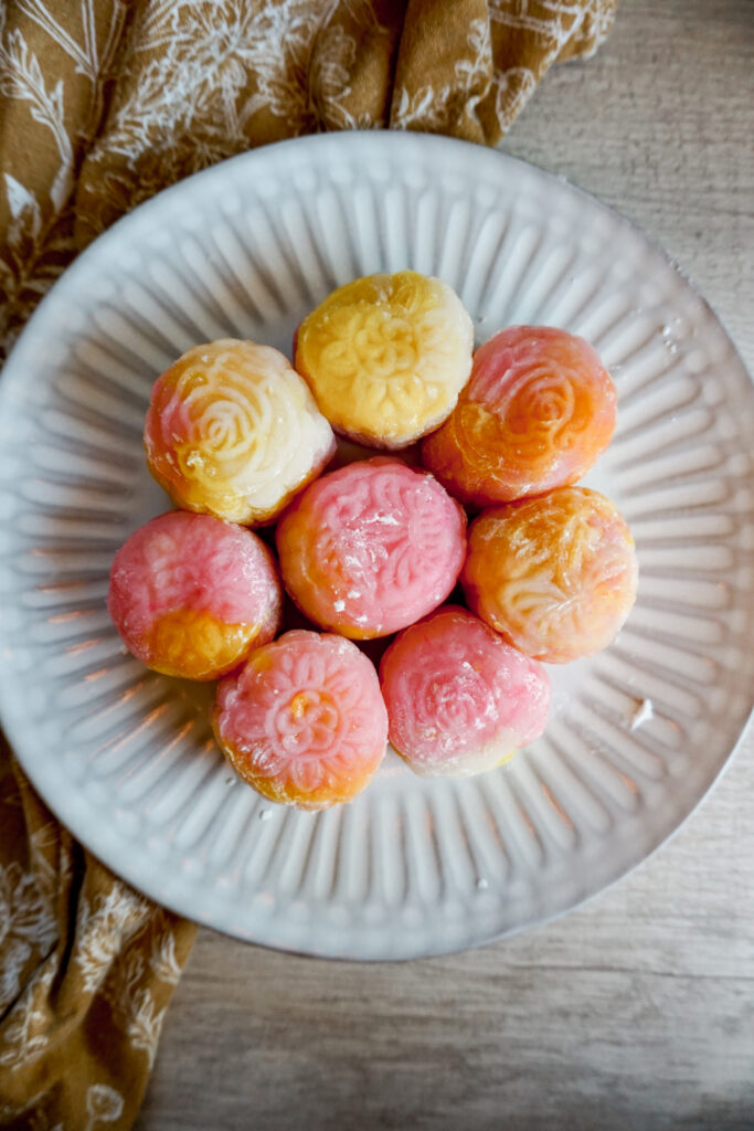 Iโm a few days late, but happy Mid Autumn Festival! The Mid Autumn Festival is a major Chinese holiday and one of the big customs during this festival is to eat mooncakes. Most mooncakes that I see sold in Chinese bakeries near me are the Cantonese style. Theyโre molded into intricate designs and baked to a golden brown. However, recently Iโve been seeing more and more snow skin mooncakes on social media! Theyโre a type of mooncake that is made from steamed rice flour. And if you know me, you know I am very well versed on steamed rice desserts. After reading many many snow skin mooncake recipes, Iโve crafted a simplified one that is perfect for beginners. I stuffed mine with store bought marzipan and some peach bites to make it extra easy, but Iโll leave you with more filling options below!