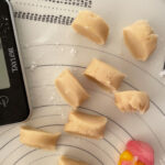 To assemble individual wrappers, take a small piece of dough from each color and squish together to form a ball. In order to ensure your mooncakes are evenly sized, it helps to weigh them out. When making 10 mooncakes in 50g molds, my wrappers were 25 g each.