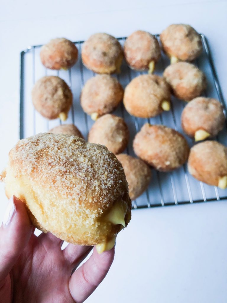 Back to the recipe โ if youโre thinking this sounds too fancy and you canโt do this, YOU CAN! The only difficult part is that this process can be a little time consuming. There are a lot of steps, but the brioche dough is SO EASY. It needs to be prepped at least one day ahead of time, so plan accordingly. The pastry cream can also be made ahead of time and kept in the fridge until ready. You do not need any special equipment EXCEPT I highly recommend getting a food thermometer to keep track of the temperature of the oil.