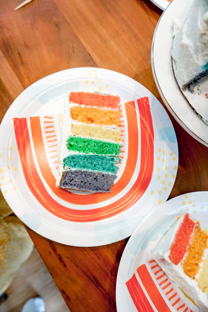 Um, hi! This post is literally a year late. I made this rainbow cake for my daughterโs fourth birthday, and sheโs now turning five. Oops!