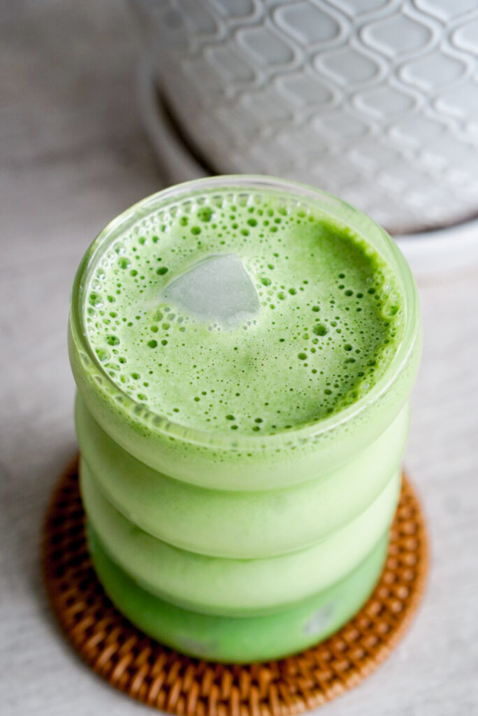 - Immediately pour into a glass full of ice and serve. Matcha foam may separate if left sitting.