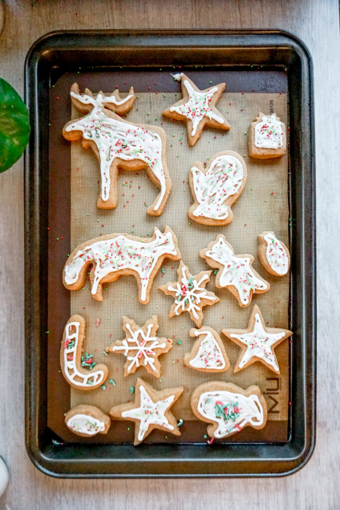 It’s not written in the recipe below, but if you care to ice your cookies for decorating, I use a simple recipe with powdered sugar. It’s not royal icing, which is the shiny and hard icing you see in a lot of bakery cookies. So it won’t look AS fancy. But with a little sprinkles and extra time to let it dry, it’ll still do the trick.