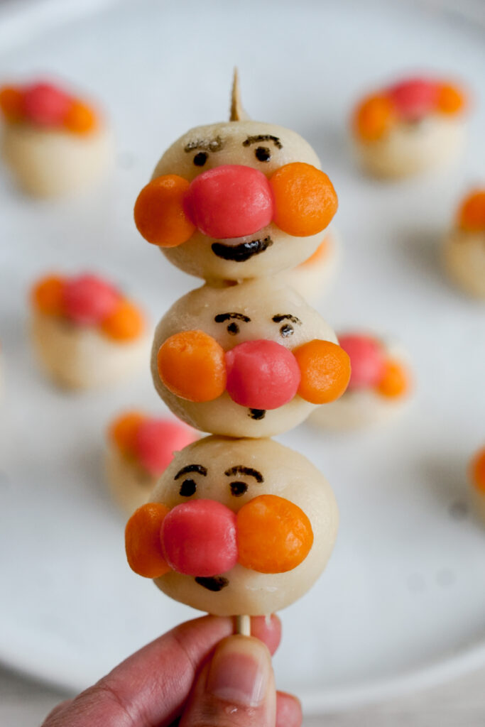 To make fun character dango, the basic recipe remains the same! Instead of rolling the dough into balls, youโll separate it according to the number of different colors you want. Dye each section using gel food coloring. I use this set from Americolor. To assemble, you just create your characters the same way you would play with clay or Play Doh. It takes some creativity and time, but itโs so much fun. Iโve found that if I keep my dough slightly on the wetter side, all the pieces adhere with just a little pressure. If your dough is a little dry and the pieces seem to fall off, you can adhere them simply by dabbing some water. When Iโm ready to cook my dango, I always like to do a test run of 1-2 dango first, to make sure that the pieces stay together when boiling.