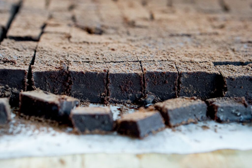 As nama chocolate is made with heavy cream, it is basically just a cubed version of a chocolate truffle. Chocolate truffles are made from a mixture of heavy cream, chocolate, butter, and liquor that you roll into balls and then dust with cocoa powder or other toppings. Rolling the truffles into balls actually gets quite messy, so Iโm a big fan of nama chocolate instead, which requires only slicing into squares.