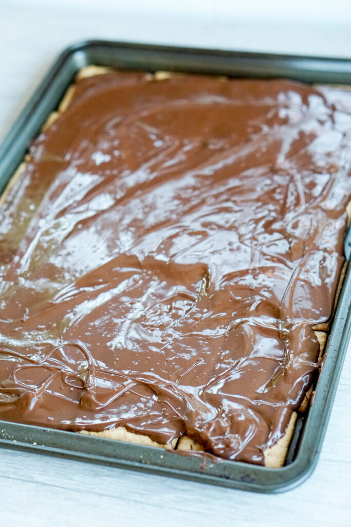 - Pour melted chocolate over graham crackers, smoothing out into a thin layer.