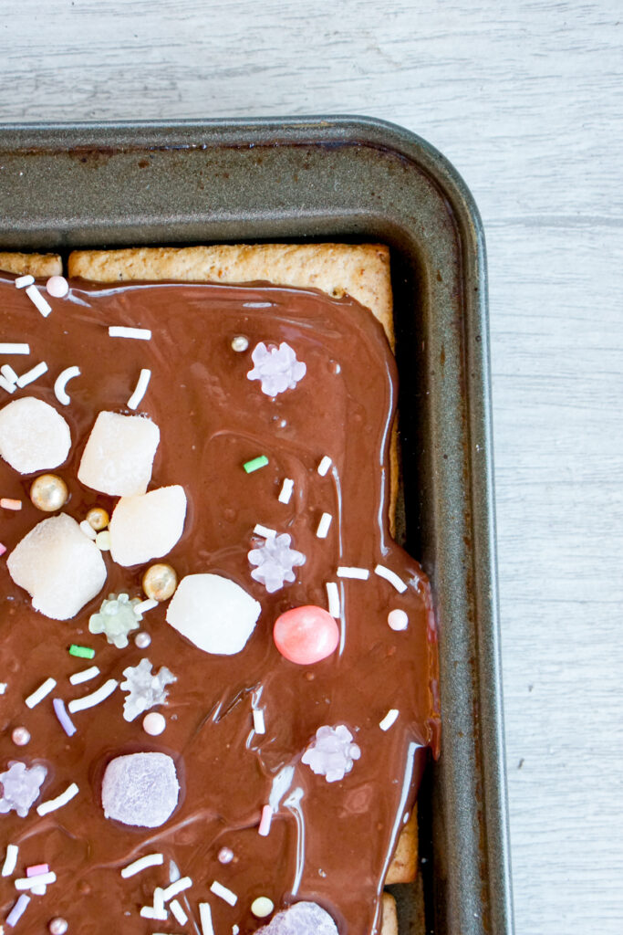 - Arrange graham crackers in a single layer on the baking tray. You may need to break the pieces into smaller rectangles to make them fit.